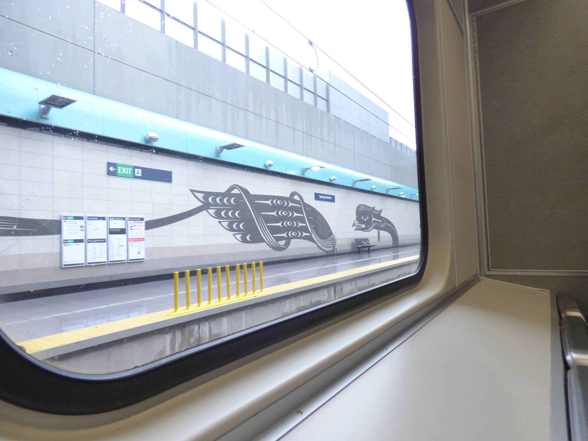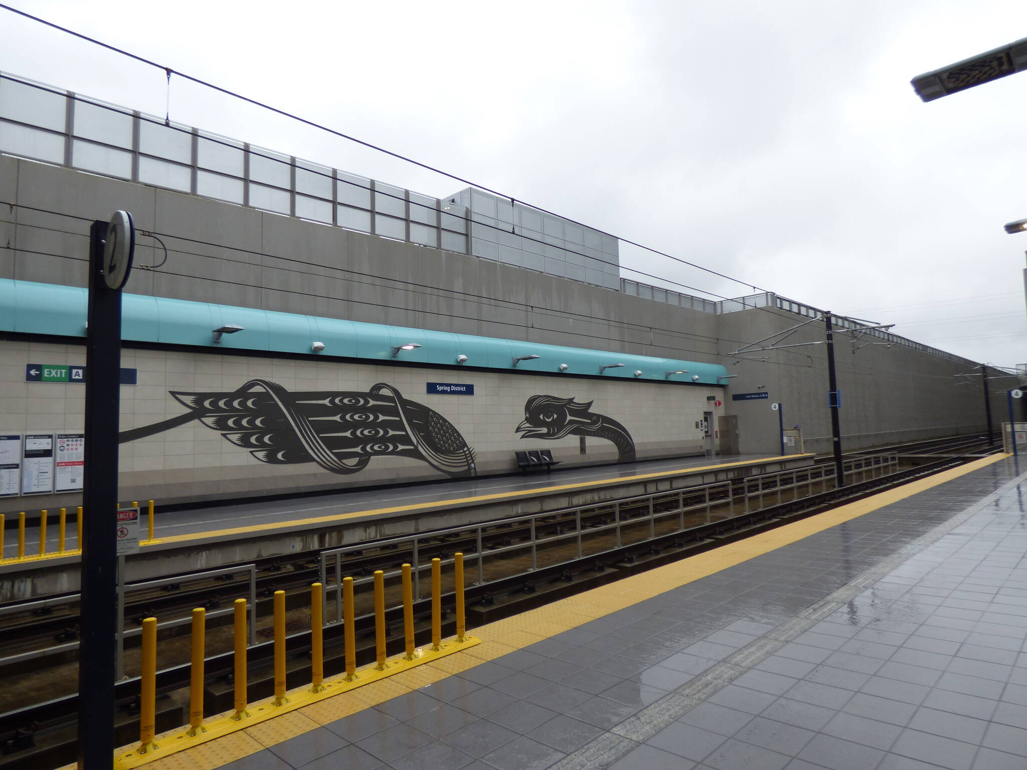Some station art includes murals reflecting the seasonal colors of the Mercer Slough, glass sheets with raindrop motifs, and a cut-metal mural blending Coast Salish and Chinese designs.