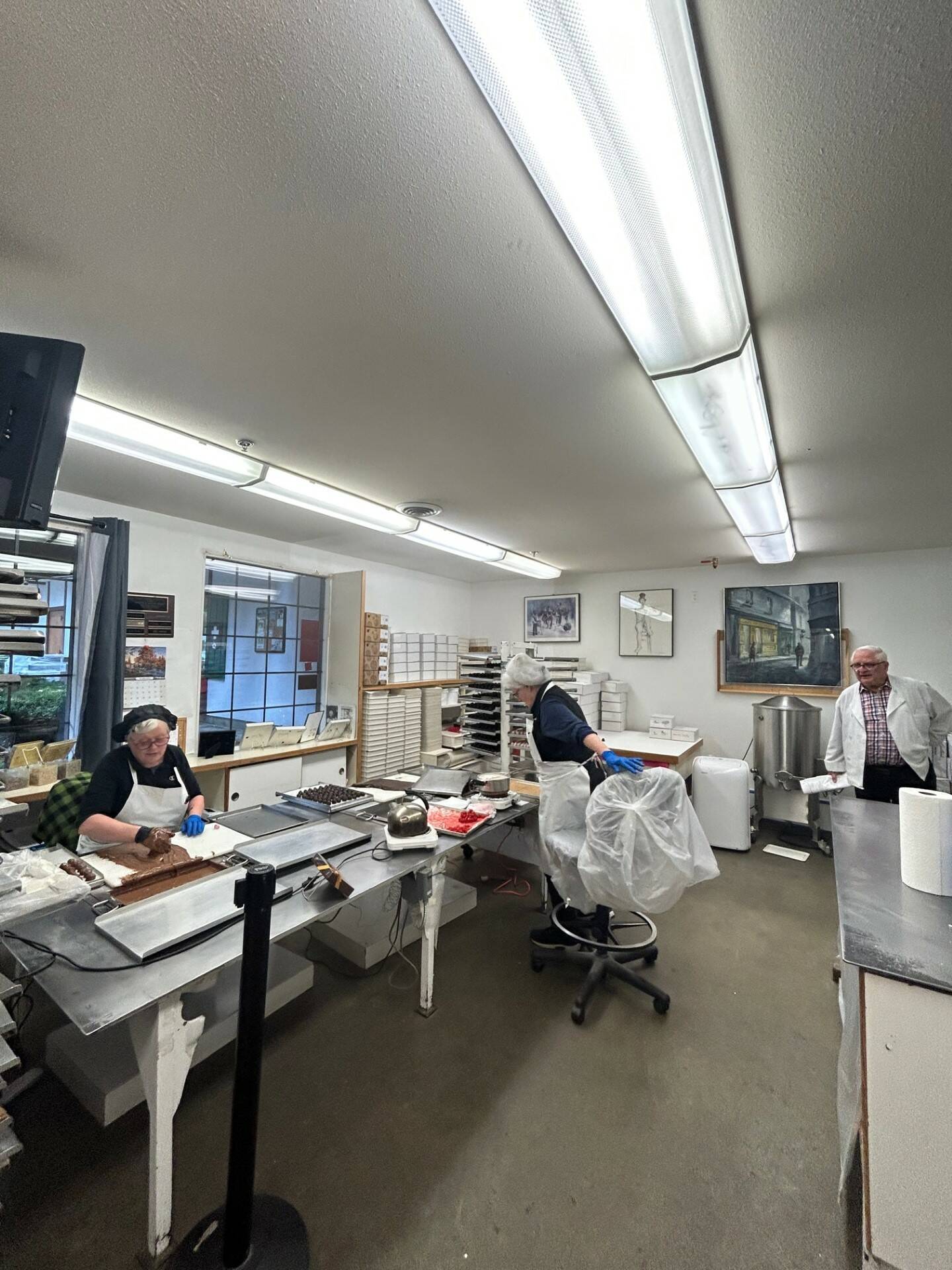 In the back is where candymakers hand roll, dip and drizzle warm chocolate over truffles.
