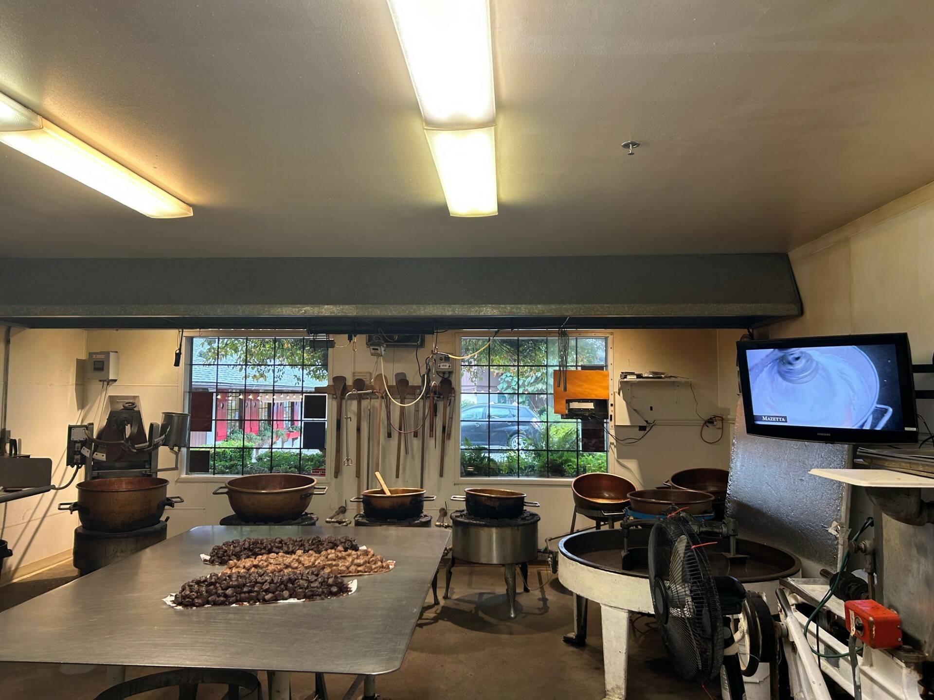 In another room, a row of copper kettles lines the wall, and a large stainless-steel table fills the room, where two long and bumpy mounds are cooling — Boehm’s classic rocky road.