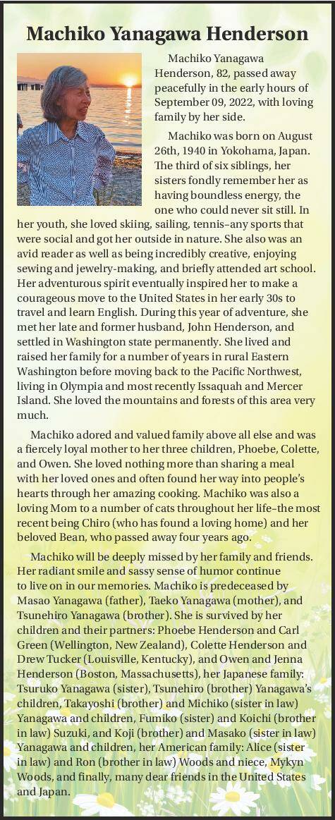 Machiko was born on August 26th, 1940 in Yokohama, Japan. The third of six siblings, her sisters fondly remember her as having boundless energy, the one who could never sit still. In her youth, she loved skiing, sailing, tennis–any sports that were social and got her outside in nature. She also was an avid reader as well as being incredibly creative, enjoying sewing and jewelry-making, and briefly attended art school. Her adventurous spirit eventually inspired her to make a courageous move to the United States in her early 30s to travel and learn English. During this year of adventure, she met her late and former husband, John Henderson, and settled in Washington state permanently. She lived and raised her family for a number of years in rural Eastern Washington before moving back to the Pacific Northwest, living in Olympia and most recently Issaquah and Mercer Island. She loved the mountains and forests of this area very much.