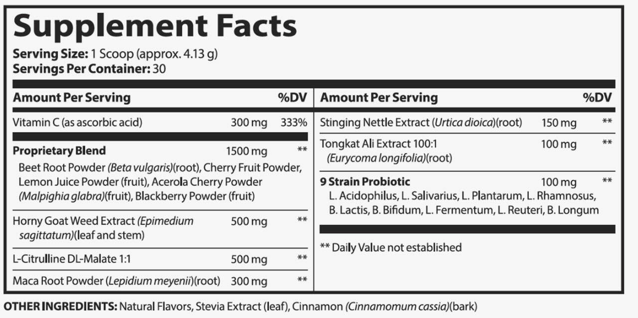 Red Boost also contains a proprietary blend of fruit and vegetable powders and a blend of probiotic strains.