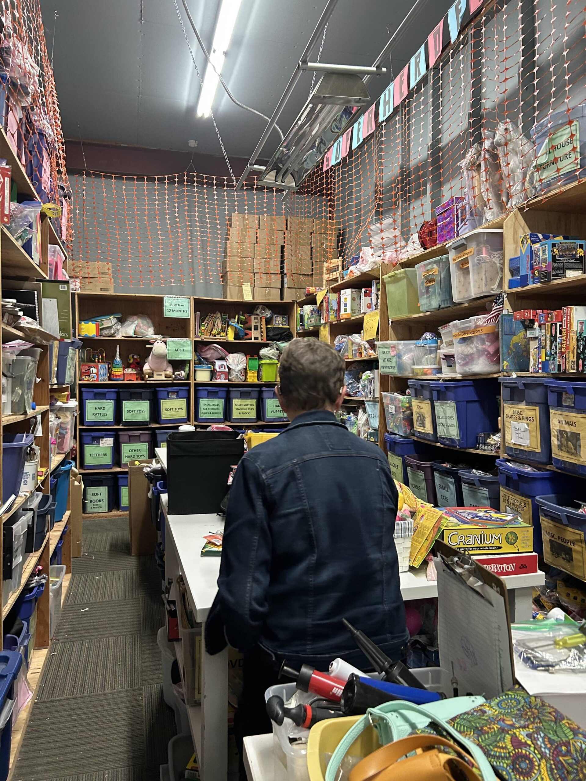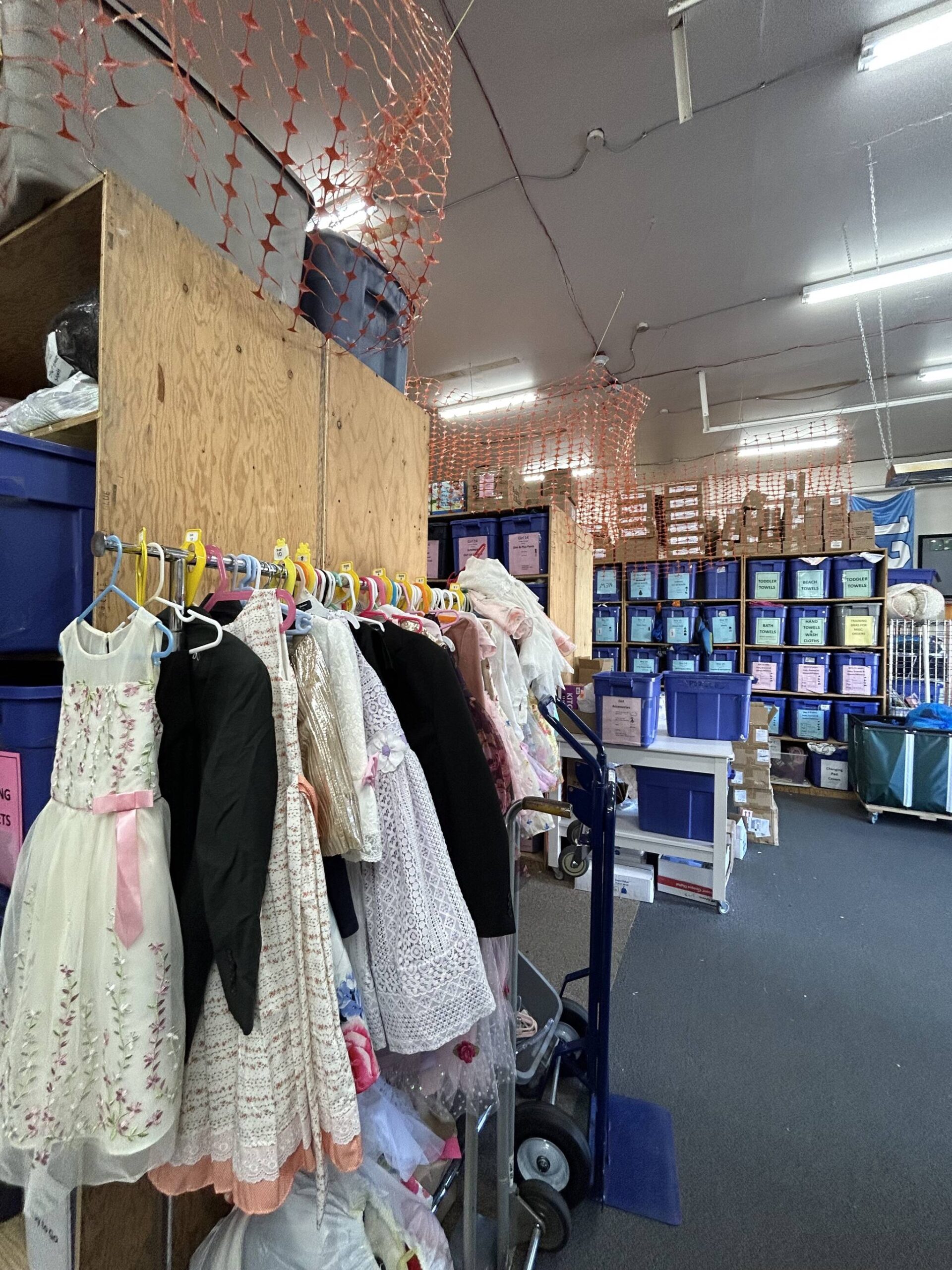 Each bin holds a different article of clothing or shoes for every age range up to 12 years old. Other shelves hold bedding, different types of formula and hygiene products, and in the corner of the warehouse, what looks like organized chaos is the toy section.