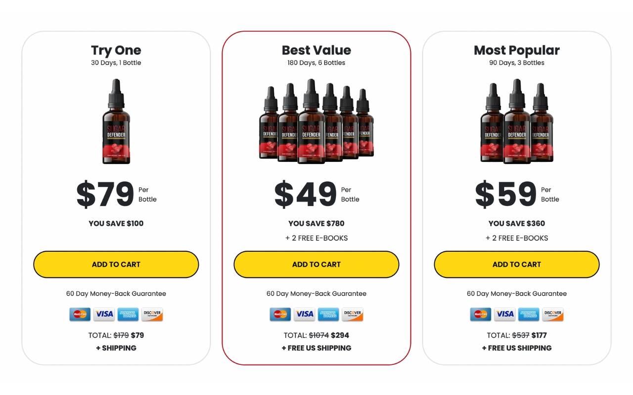 - 1 Bottle: The price for a single bottle of Sugar Defender is $69. This option is ideal for those who want to try the product for the first time. Please note that shipping charges apply.
